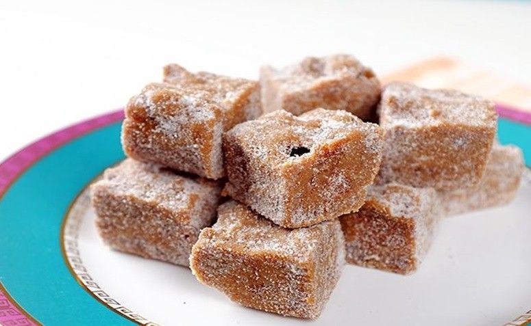 - Deixe esfriar, retire da forma soltando o papel. Corte em quadradinhos ou em formato a gosto. Passe em mais açúcar.