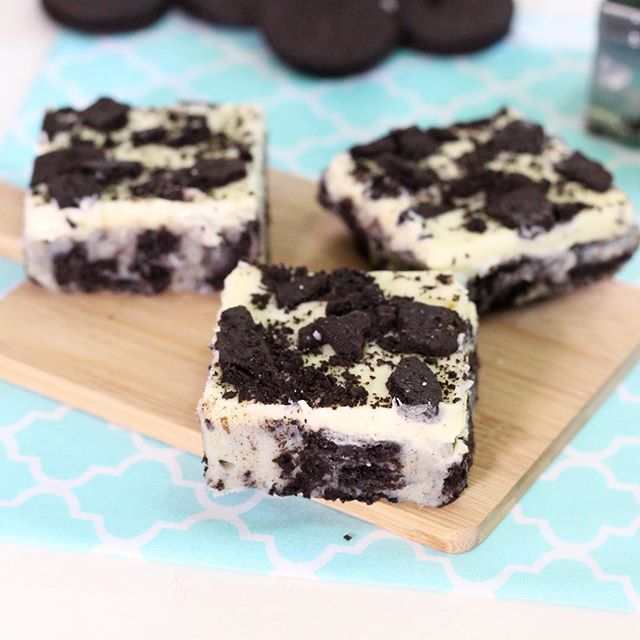 - Cortar em quadrados menores, decorar com biscoito oreo picado e servir.