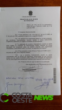 O Confea (Conselho Federal de Engenharia e Agronomia) e o Crea/PR declararam apoio a um projeto de lei apresentado pelo deputado federal José Carlos Schiavinato (Progressistas) na Câmara Federal. Trata-se do PL nº 1039/2019, protocolado nesta quinta-feira (21) na Câmara dos Deputados. A redação foi endossada com a assinatura dos presidentes das entidades, Joel Krüger (Confea) e Ricardo Rocha de Oliveira (Crea/PR).