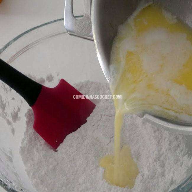 Despeje o leite fervendo em cima dessa mistura e vá mexendo com uma colher para escaldar.