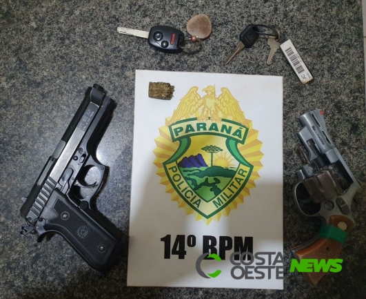 Os militares localizaram um revólver prateado da marca Tango, calibre .32 sem munições e um simulacro de pistola marca Taurus. E uma porção de maconha.