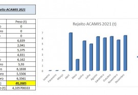 A má notícia é que junto aos materiais recicláveis estão os rejeitos. A média de rejeitos, que são os materiais que não podem ser reciclados e devem ser destinados ao aterro sanitário, é de 4 toneladas por mês. O maior registro de rejeitos ocorreu em abril de 2021 com 6,8 toneladas.