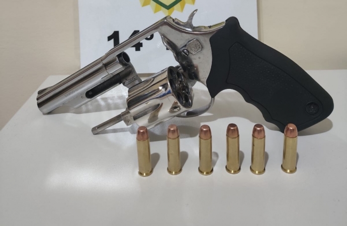 Em revista veicular, os policiais encontraram um revólver calibre .357 escondido embaixo do tapete do motorista. A arma estava municiada com seis cartuchos intactos e pronta para uso.