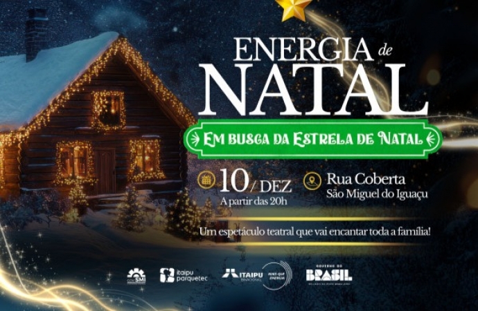 São Miguel do Iguaçu vai receber, no próximo dia 10 de dezembro, o espetáculo “Energia de Natal – Em Busca da Estrela de Natal”, a partir das 20h00, na Rua Coberta Addy Cavalca. O evento é promovido pela Itaipu Binacional e pelo Itaipu-Parquetec, em parceria com o Governo Municipal, por meio da Secretaria de Cultura e Esporte, e chega ao município pelo terceiro ano consecutivo.