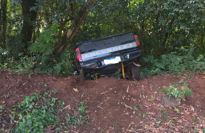 A equipe policial foi acionada para atender uma colisão envolvendo dois veículos. No local, os agentes encontraram um Chevrolet Onix estacionado com danos causados por uma batida. Cerca de duas quadras adiante, uma caminhonete GM/S10 Advantage foi localizada entre árvores à beira de um rio, impedida de cair no córrego pela vegetação densa.