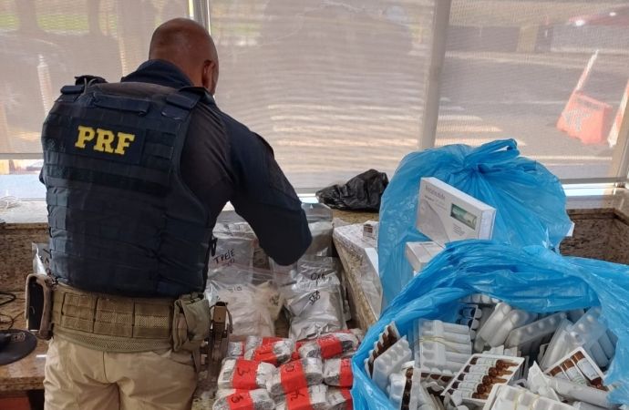 A fiscalização ocorreu por volta das 15h40, quando os policiais abordaram uma van com placas do Paraguai, que seguia no sentido decrescente da rodovia. Durante a vistoria no veículo, foram localizadas diversas embalagens de medicamentos e ampolas de anabolizantes sem a devida regularização para entrada e comercialização no Brasil.