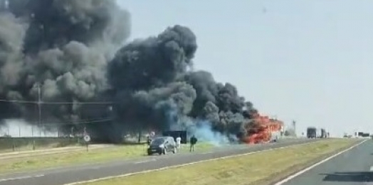As chamas se espalharam rapidamente pelo veículo, gerando uma densa fumaça escura que era visível de longe.